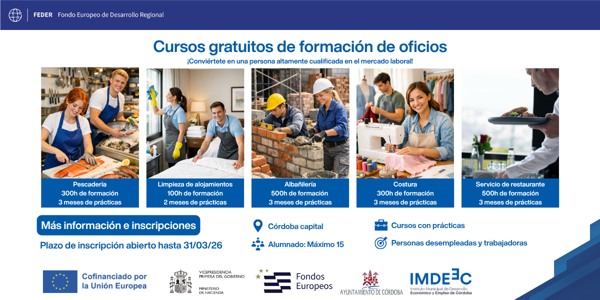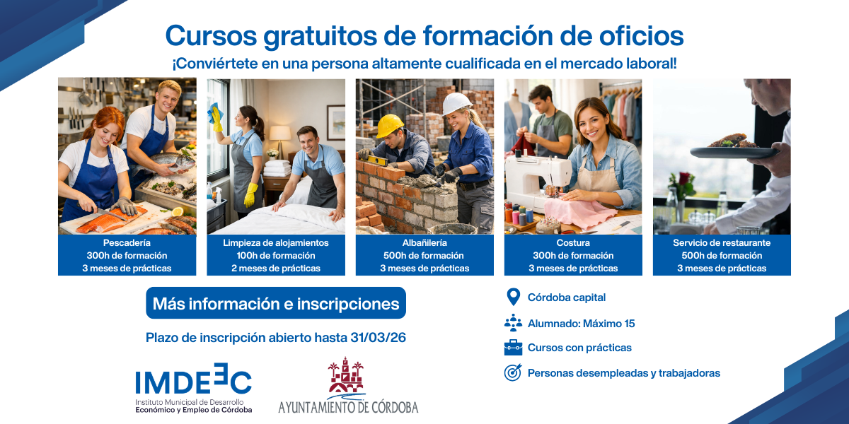 3 febrero, 2026El Instituto Municipal de Desarrollo Económico y Empleo de Córdoba (IMDEEC) ha puesto en marcha el programa experimental ‘Autoempleo en Córdoba: Construyendo tu propio futuro’. Esta iniciativa, que ya cuenta con sus primeros 15 alumnos en activo, está diseñada para dotar de herramientas empresariales a personas desempleadas pertenecientes a colectivos prioritarios: mujeres, menores de 30 años, mayores de 45, personas con discapacidad y personas en riesgo de exclusión social.
